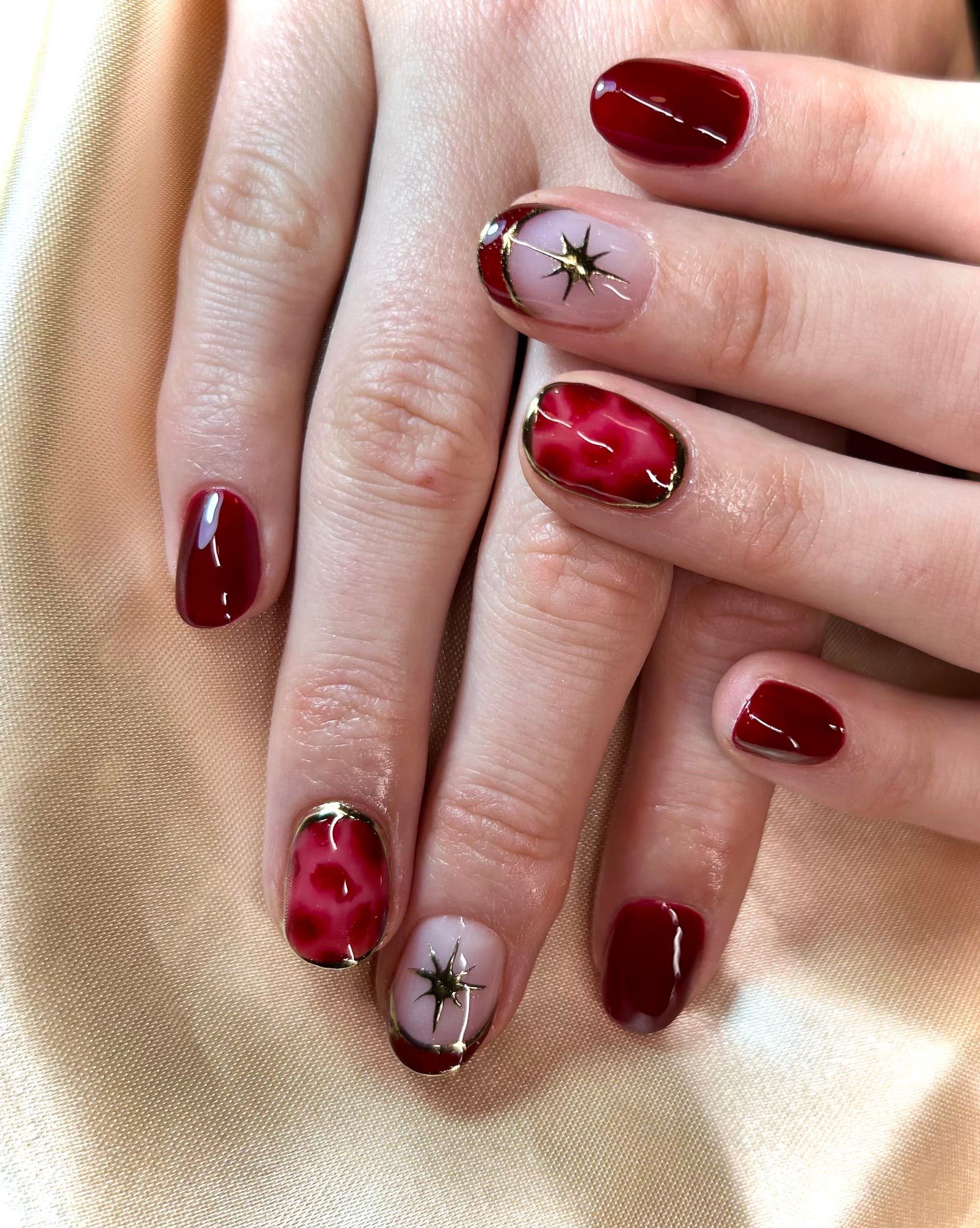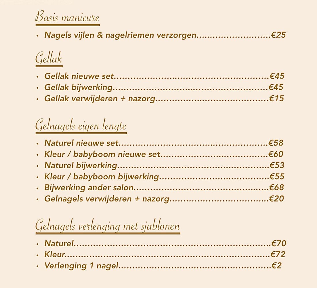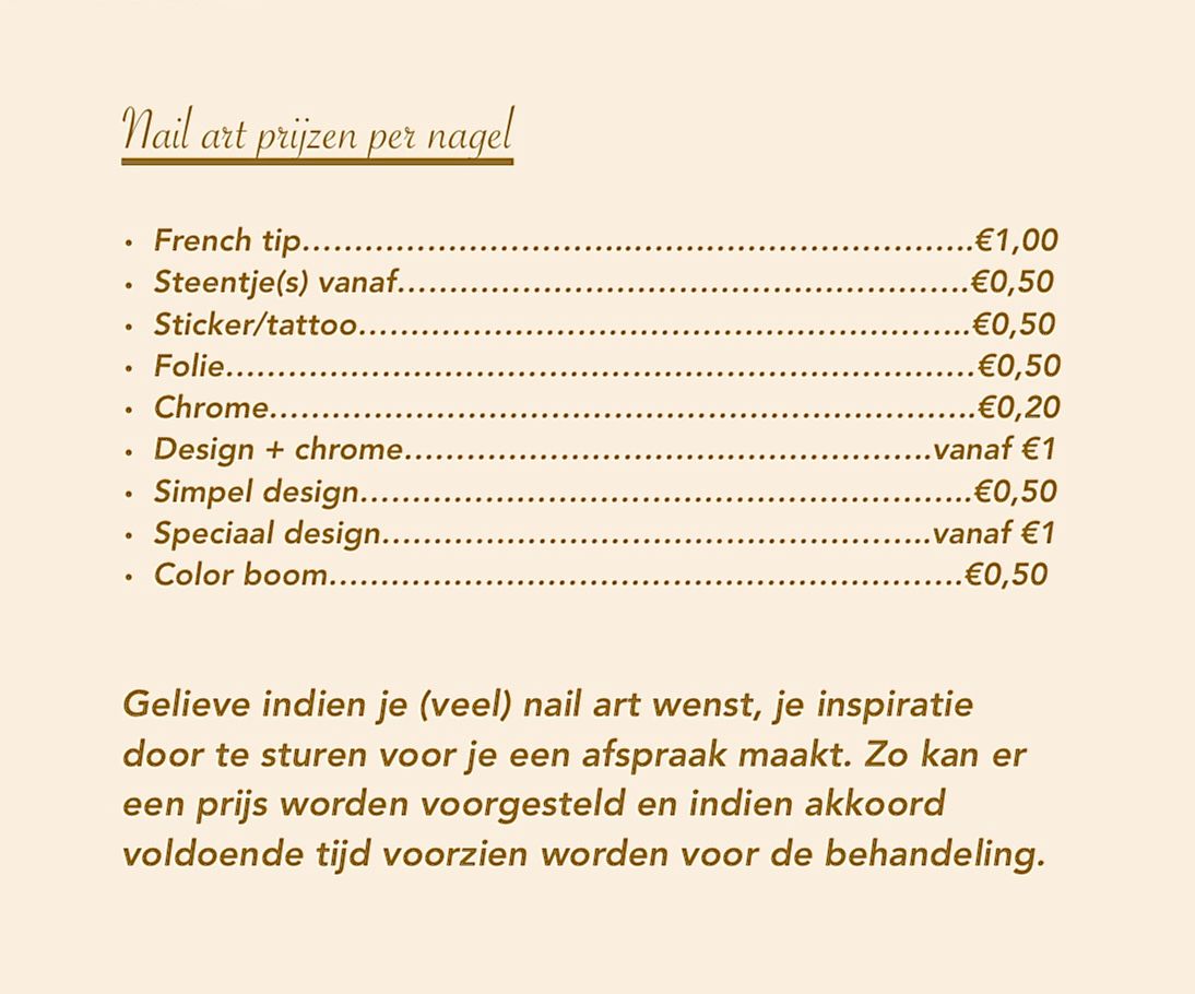 Er is een ruime keuze aan nail art in het salon. Enkele voorbeelden zijn: stickers, chrome poeders, kleurfolies, steentjes, glitters en uiteraard ook handgetekende designs.