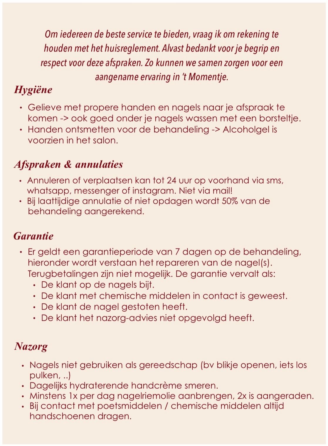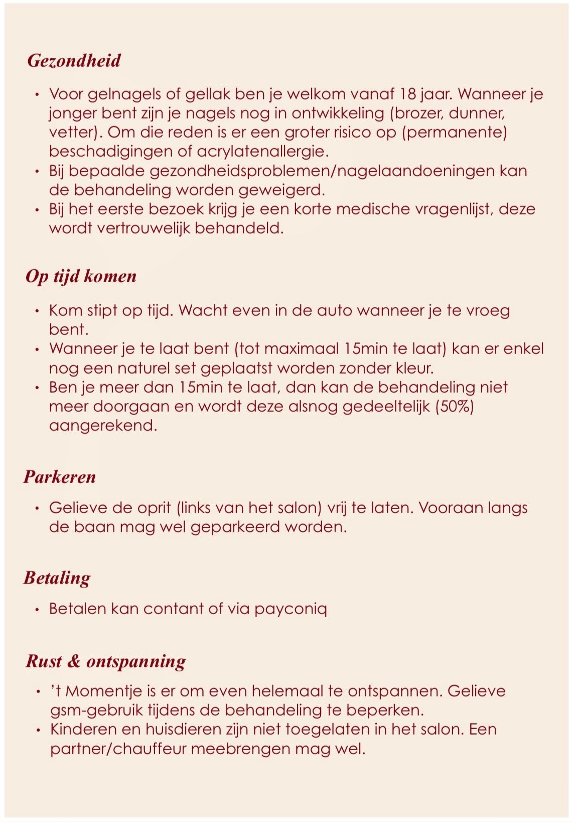Een basis manicure focust op de verzorging van de natuurlijke nagels en handen. De nagels worden gevijld en gepolijst, de nagelriemen verzorgd en de handen afgewerkt met een hydraterende handcrème. Ideaal als onderhoud of als verwenmoment voor jezelf.